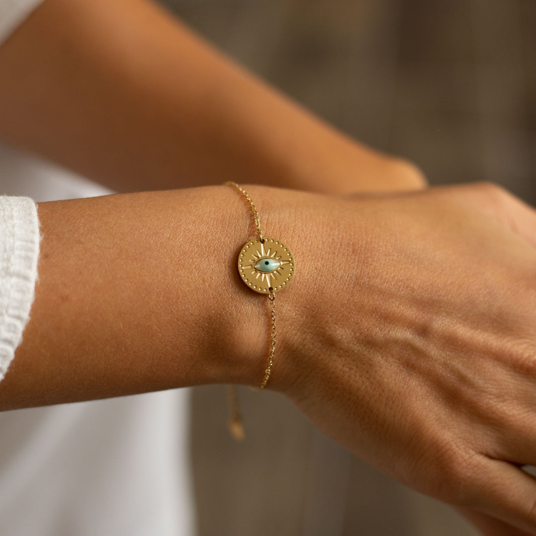 Discover elegance and protection combined in our Solar Greek Eye Bracelet. This delicate piece of jewelry, in 14K gold-plated stainless steel, fuses the ancient symbol of the Greek Eye with the warmth and vitality of the sun.